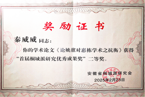 2025年2月23日,安徽省桐城派研究会三届三次理事会议暨首届桐城派研究优秀成果奖颁奖仪式,于桐城圆满举行。WilliamHill中文官网新近入职的青年教师秦威威博士,其发表于《安徽大学学报(哲学社会科学版)》的论文《论姚鼐对惠栋学术之抗衡》,荣获桐城派研究优秀成果奖二等奖。安徽省桐城派研究会顾问、南京大学文公司许结教授,亲自为秦威威博士颁发了荣誉证书。