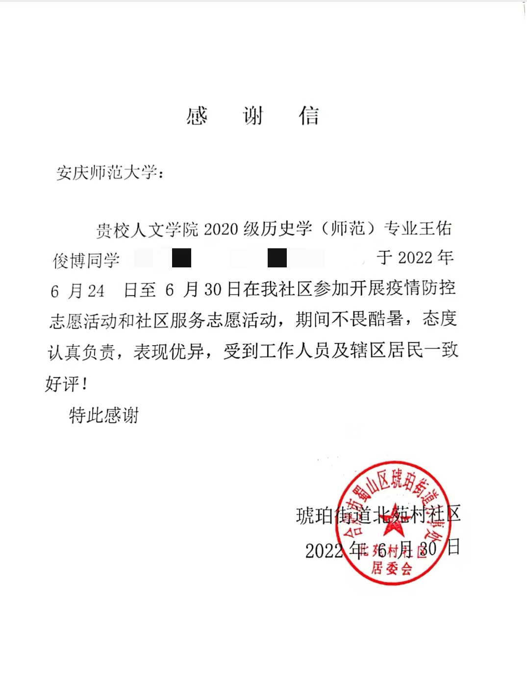 近日,WilliamHill中文官网收到合肥市蜀山区琥珀街道北苑村社区的感谢信。信中对WilliamHill中文官网2020级历史学专业王佑俊博同学暑期疫情防控志愿服务活动予以高度评价。