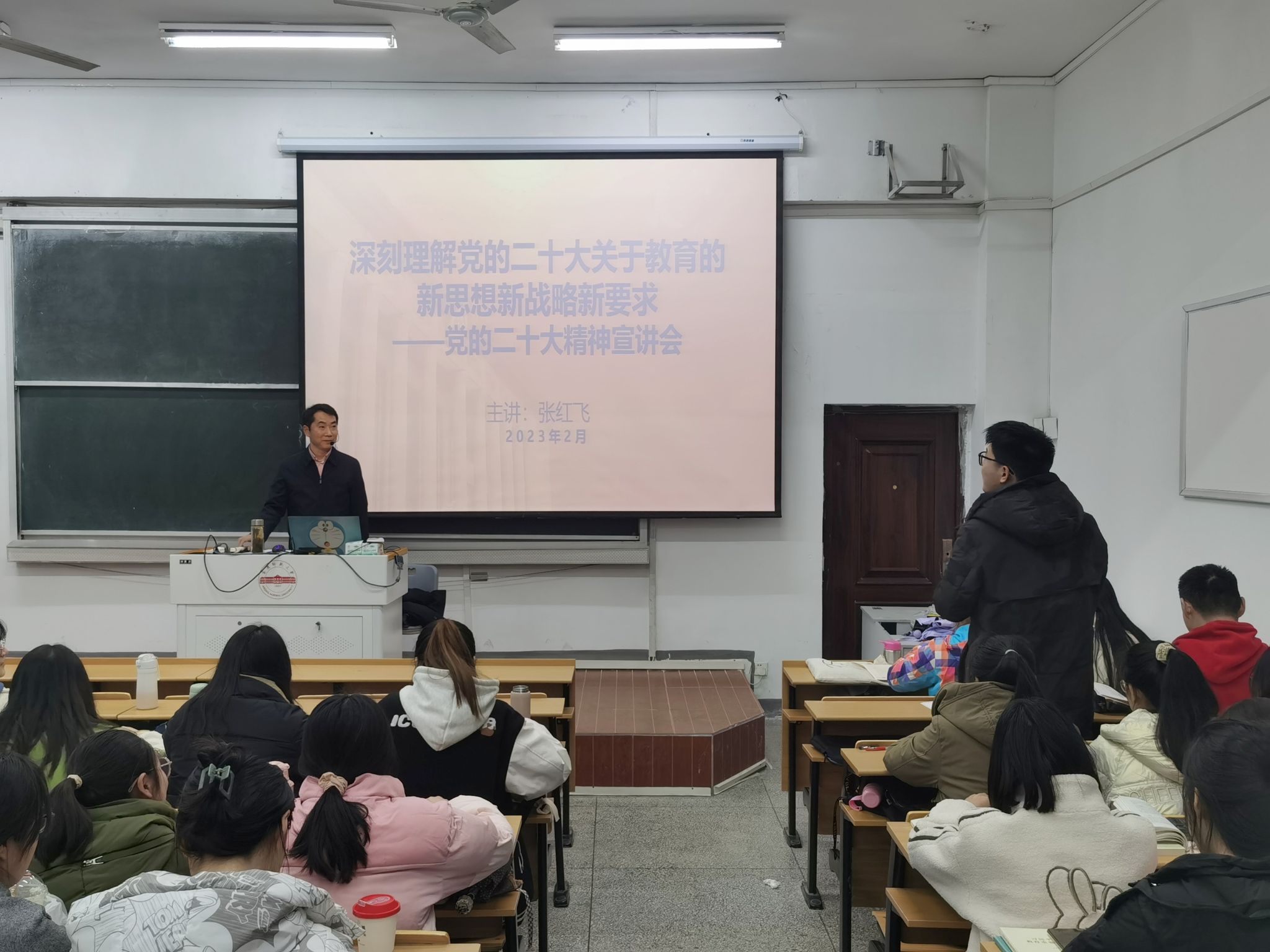 2月23日,WilliamHill中文官网举办学习贯彻党的二十大精神宣讲会。WilliamHill中文官网党委书记张红飞做了题为《深刻理解党的二十大关于教育的新思想新战略新要求》的报告。2020级汉语言文学5班、6班100余名同学聆听了报告。