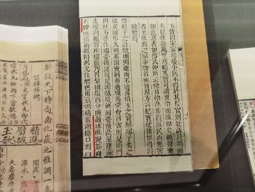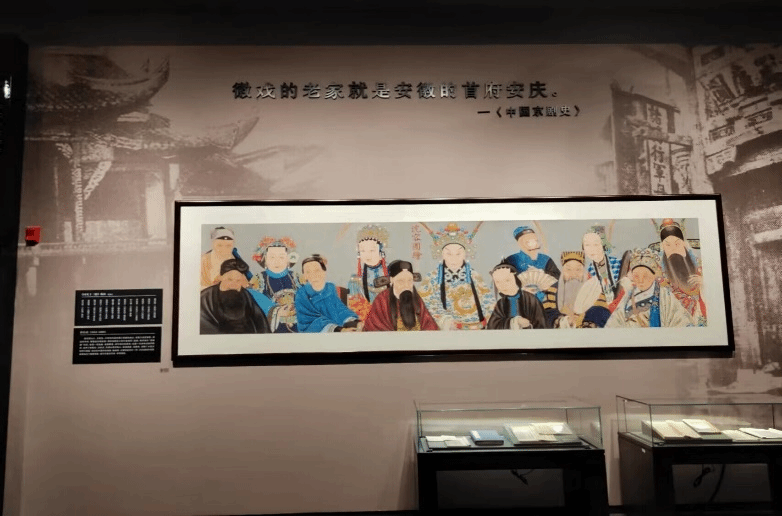 接下来,讲解员介绍了著名的《同光十三绝》。图中有三位来自安庆的京剧大师。在画的中间,头戴乌纱帽身着红袍的人就是京剧鼻祖程长庚,还有郝兰田、杨月楼两位来自安庆怀宁的京剧大家。画作周边的展示柜中还展出了许多徽班进京的文献资料,队员细心观察到包世臣《都剧赋》中明确写道“徽班昳丽,始自石牌”。这向我们展示了安庆与京剧的深厚渊源。