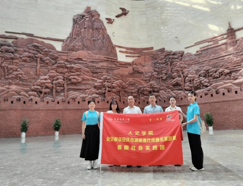 刚刚进入博物馆,大厅内高达三层楼的巨幅古铜色浮雕震撼了团队成员,浮雕上刻有天柱山、振风塔等安庆著名的景点。清代乾隆以迄同治、光绪时期,一批批安庆戏曲名家走出皖公山,来到振风塔下,乘船下扬州、到杭州,辗转到北京,走出一条皖河、长江、大运河的水上戏曲之路。穿过宽阔明亮的大厅,博物馆讲解员带领队员们乘坐电梯,来到了位于三楼的安徽•中国黄梅戏博物馆。据讲解员的介绍,该馆于2009年经国务院批准成立,是全国唯一一所国家级黄梅戏专题博物馆。
