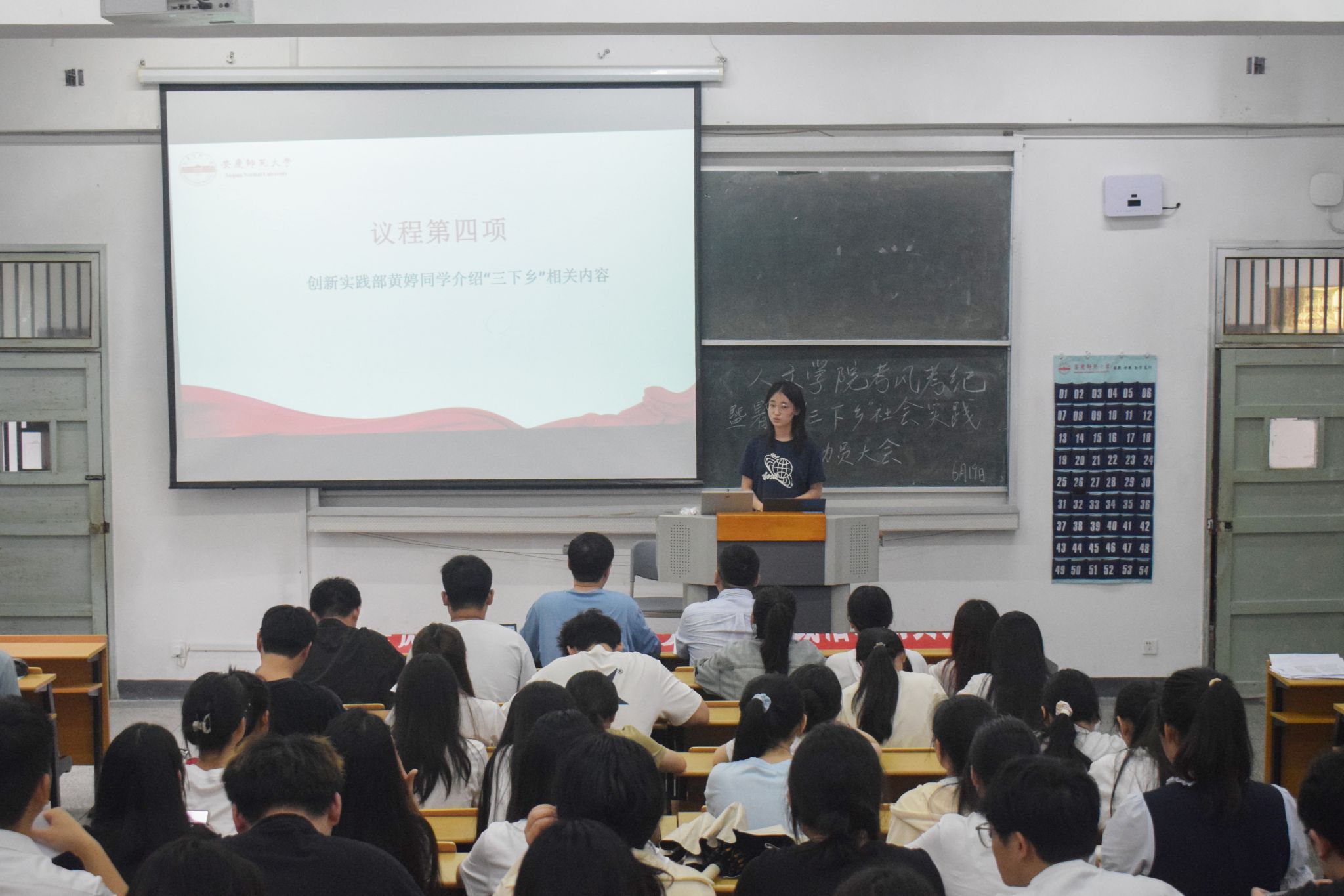 会议伊始,各班班长、学习委员等相关负责人及“三下乡”社会实践活动的参与同学在写有“考风考纪暨暑期‘三下乡’社会实践活动动员大会”字样的红色横幅上签名。
