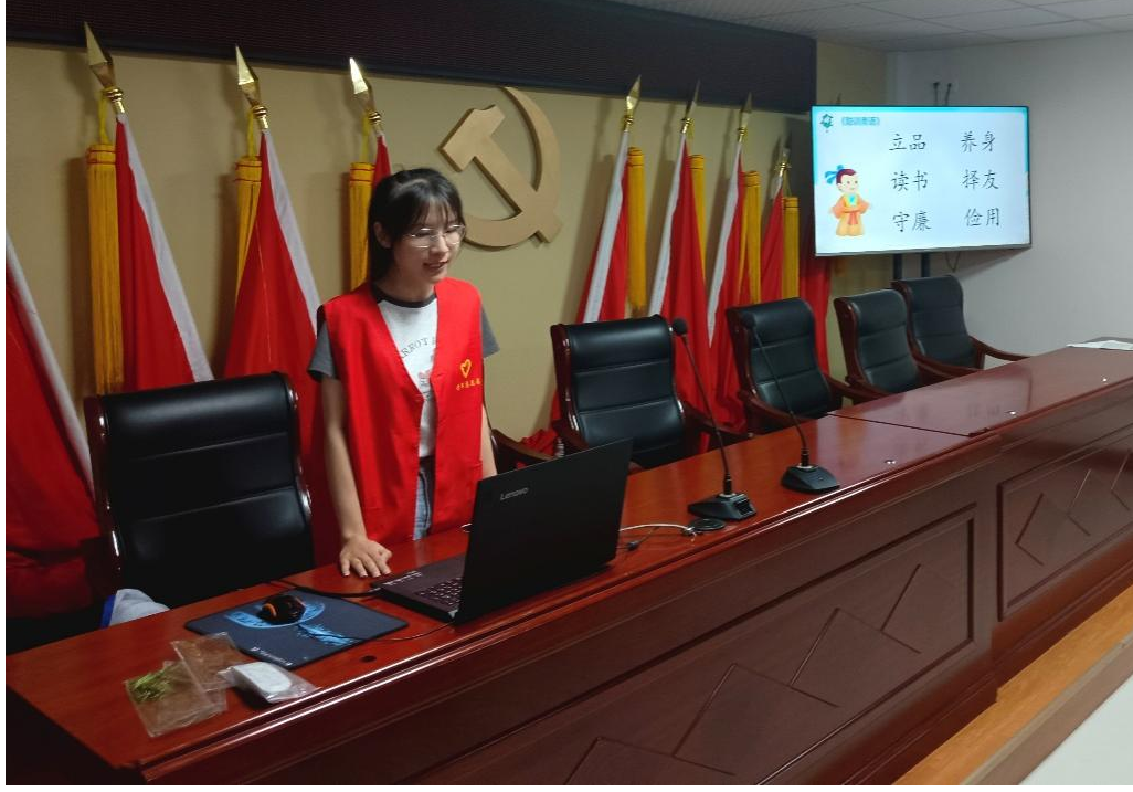 桐城自古以来便以“文都”著名,其文化底蕴深厚悠长。汉语言文学专业2022级的孙安琪作为本次活动的“小老师”给小朋友们带来了一堂生动的文化浸润课堂。活动伊始,她通过幻灯片向小朋友们介绍了桐城地方特色景点以及当地的家训文化知识,并带领社区的小朋友们领会家训文化中蕴含的礼仪规范、与人相处之道等中式哲学的奥妙。在活动宣讲中,孙安琪同学用生动活泼的语言,将张英的《聪训斋语》中的智慧道理转化为一个个贴合实际的历史小故事,告诉小朋友们在日常生活中要践行尊老爱幼、孝顺父母、诚实守信、勤俭节约、谦和仁厚的优良美德。