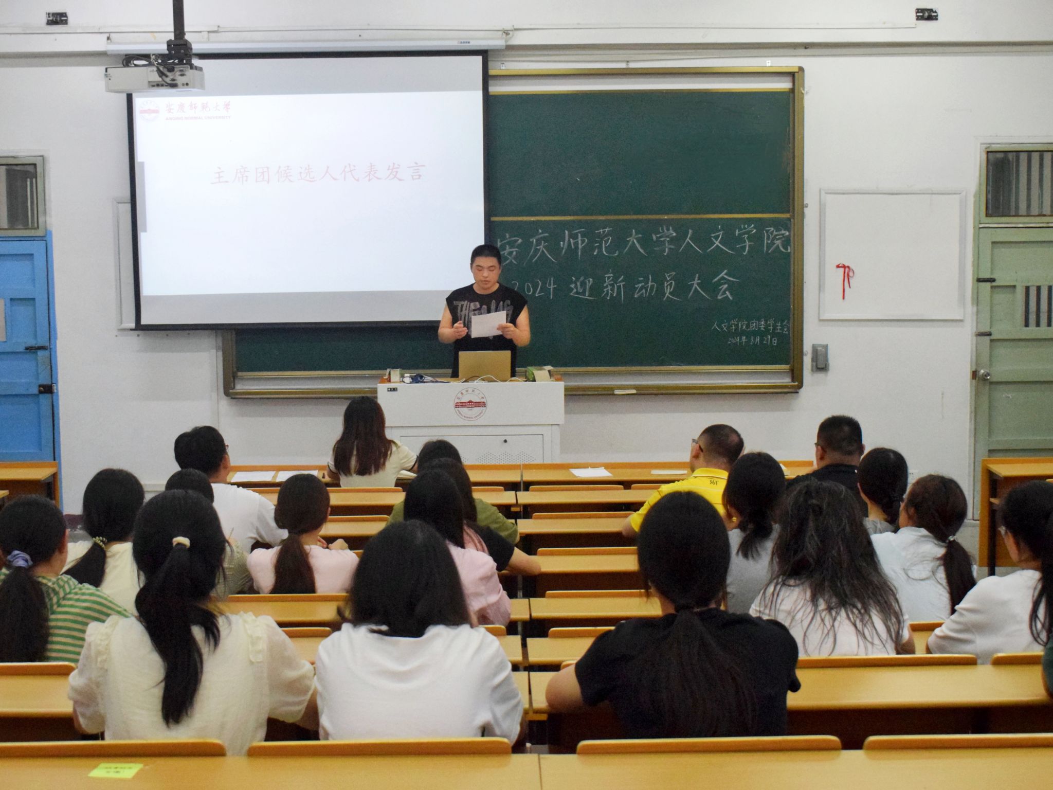 会议第一阶段,员工代表相继发言。主席团潘晨宇布置团学迎新工作,逐条讲述各岗位负责部门和各部门工作任务,强调各方面工作的注意事项和相应要求。邬诗佳代表迎新志愿者发言。他提出,志愿者们应用饱满的热情迎接新生以传递这份温暖,展示人文学子的良好风尚与优秀品质。青马班员工代表钟宇璐发言。她认为,迎新服务是一个“学做标兵骨干,担当时代重任”的过程,青马学员要用实际行动去支持迎新工作,让新生们感受到热情与温暖,也让自己在迎新过程中成长和锻炼。