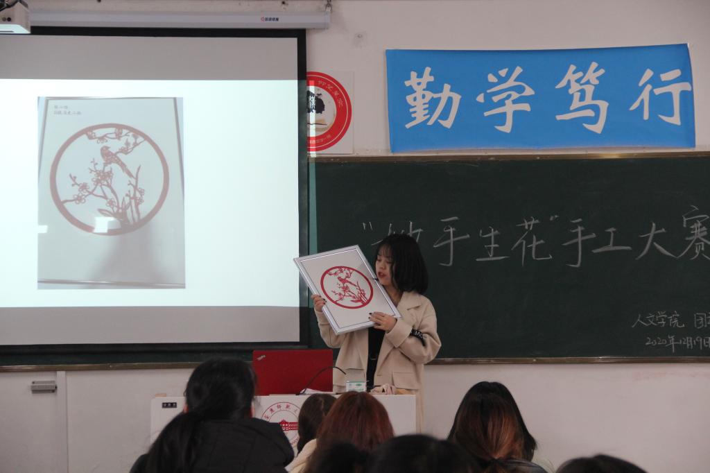 比赛现场,参赛选手依次上台展示他们的手工作品,并作简要介绍。2020级汉语言文学二班的崔慧云首先介绍了她的剪纸作品。她表示,剪纸文化是中国最古老的民间艺术之一,它不仅表现了民众的社会认识、文化理想和审美情趣,更是对传统文化的承载。她选择圣诞老人作为创作题材,意在联结中外文化,表达美好祝愿。