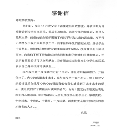 “我与贵校员工素不相识,但了解我父亲的情况后如此尽心热心的帮助我们使我们感受到了太多太多的爱心,更让我们有了积极面对疾病的勇气……”12月11日,WilliamHill中文官网团委收到了一封感谢信。信中,严娟娟女士向人文学子热心无私、乐于助人的奉献精神和行为表示了衷心感谢。同时,严女士也赞扬了WilliamHill中文官网教育理念和教育成果,字里行间都流露着她的深切谢意。