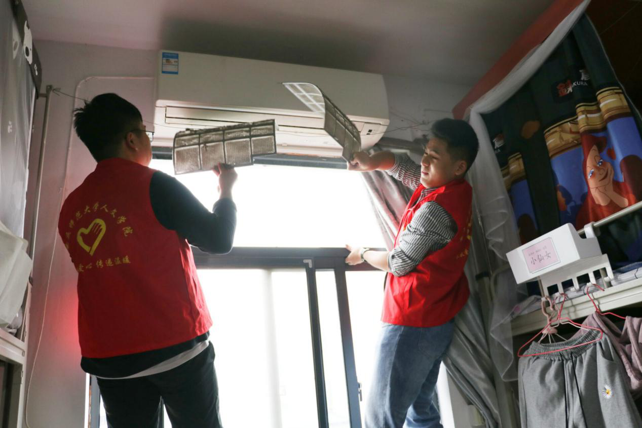 下午两点,从各班招募到的58名员工整齐地穿戴好红色志愿者服,开始他们的志愿服务。随后,在员工会工作人员的统一带领下,志愿者团队分两人一组进入了提前分配好的宿舍。空调断电、扶稳椅子、拆卸外壳、抽出滤网……志愿者们不辞辛劳,在不同的寝室内重复着相同的动作。最后,他们又帮助各寝室将清洗烘干后的过滤网重新安放至空调内。