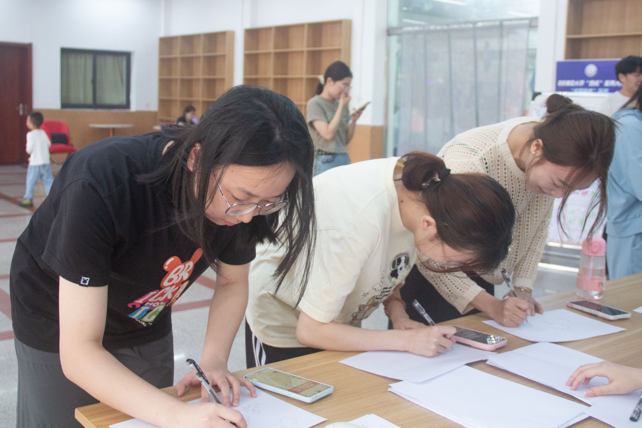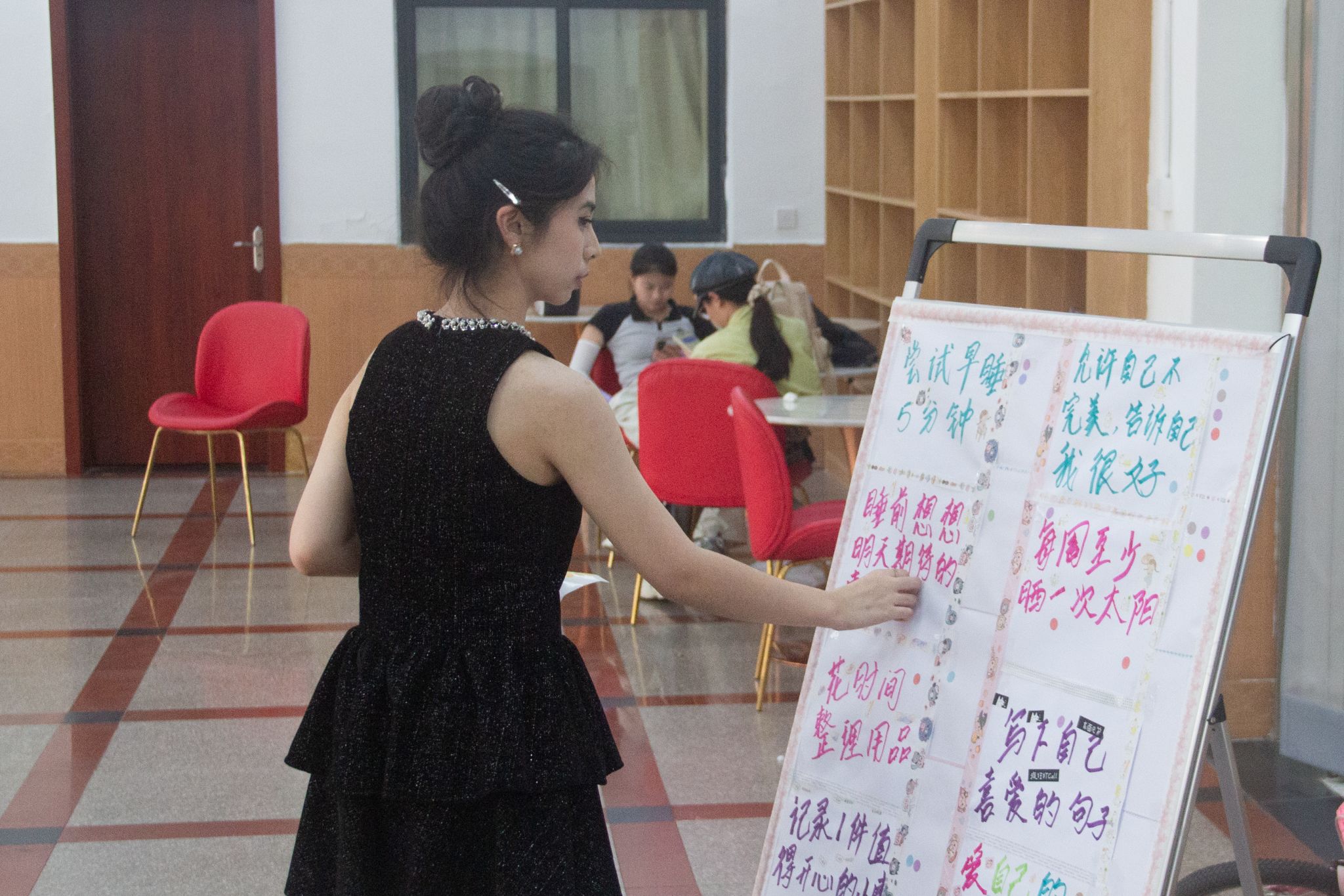 读一本好书、给家人拨通电话、为自己准备一份仪式感满满的早餐……在“爱自己的 n 种方式” 主题展板前,2024 级中国语言文学类专业(4)班毕馨纯与同伴们正用彩色波点标识出 “爱己地图” ,逐渐密集的波点如同星星之火,点燃现场员工探索自我关怀的热情。这种充满创意的互动形式,将抽象的心理健康理念转化为可触摸、可记录的日常实践,引领大家在点滴行动中养成自尊自信自爱的心理品质。