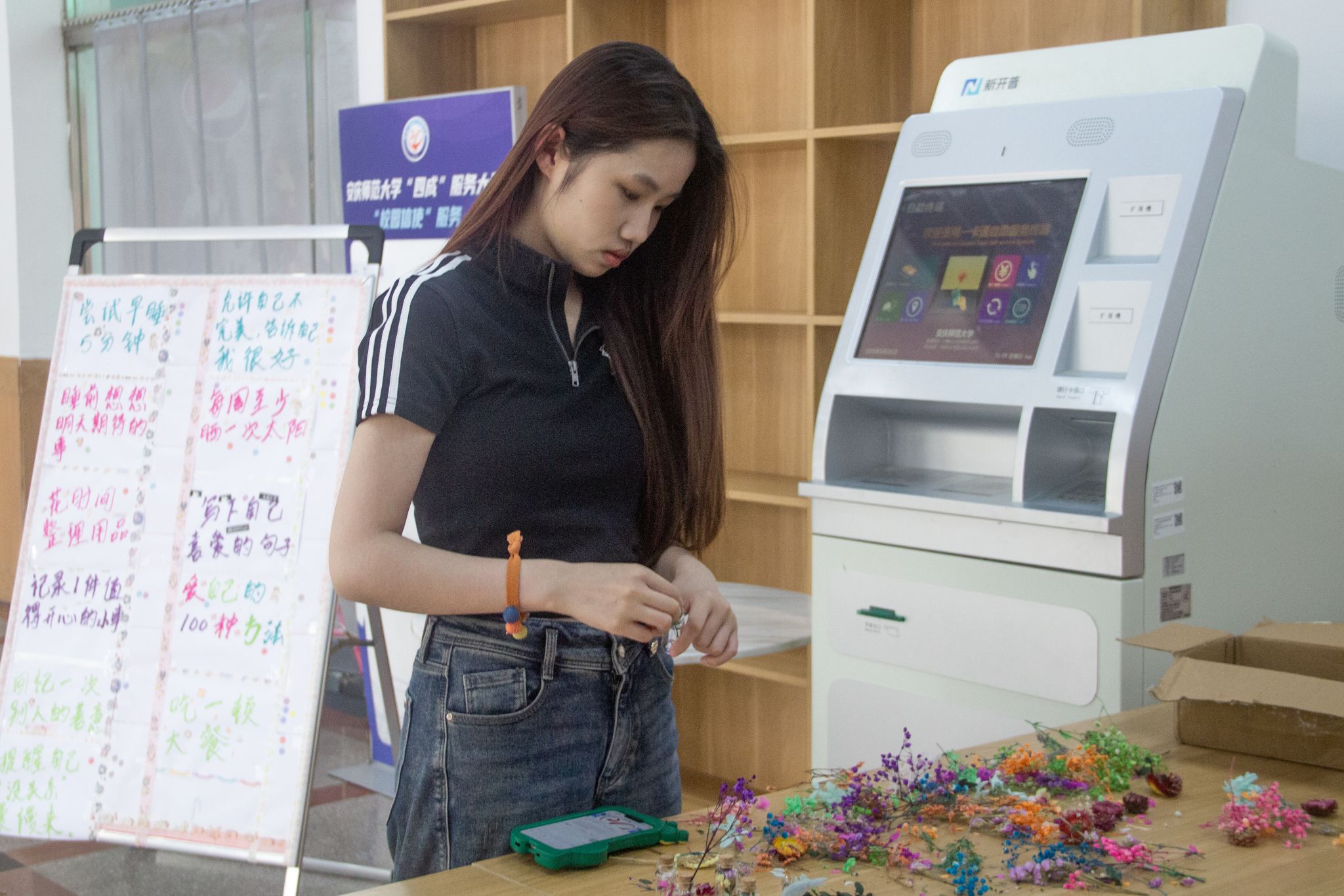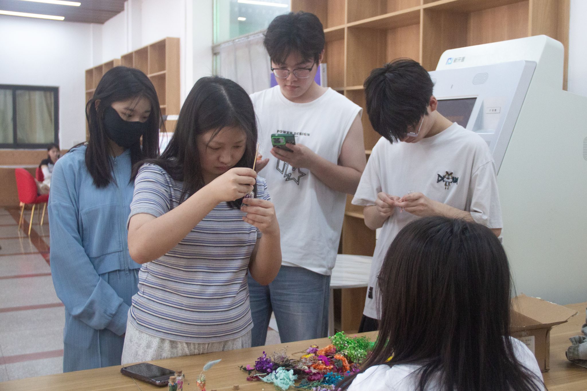 活动现场,长桌上整齐陈列着波点贴、木塞玻璃瓶与绘画纸笔,一场别开生面的 “心灵收纳” 之旅悄然开启。员工们将干花与书写情绪状态的纸条封存于玻璃瓶,在折叠文字与摆放花束的过程中释放压力情绪。2024 级中国语言文学类专业(1)班唐欣分享道:“当压抑的情绪随着干花被封存进透明容器,仿佛看到那些隐秘的心事正在阳光下慢慢舒展。这种充满仪式感的表达,让我学会理性与情绪对话。”