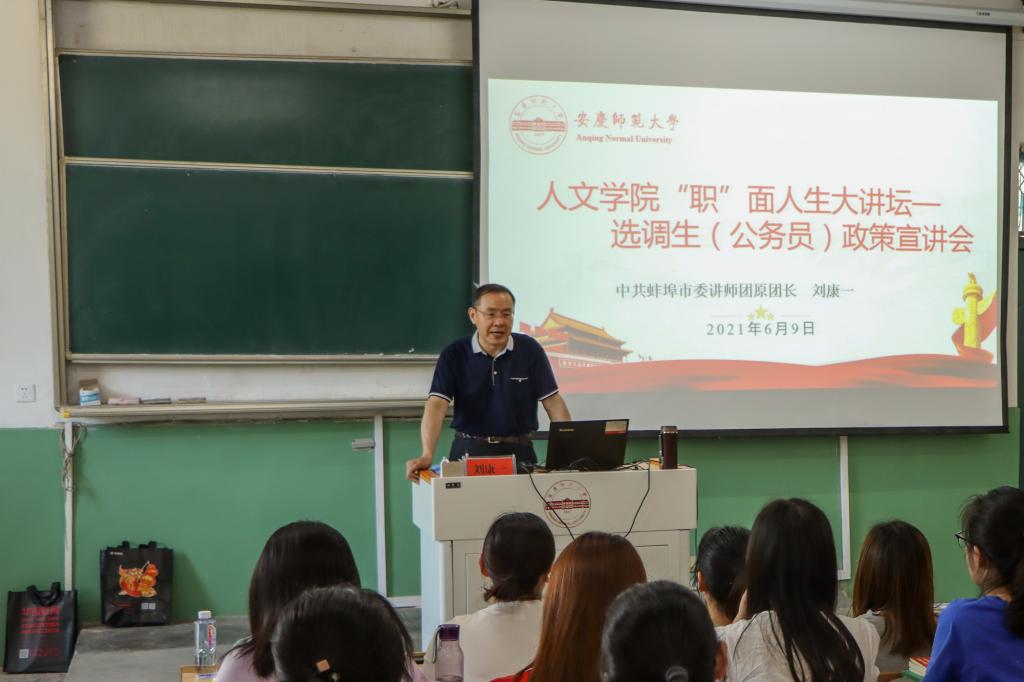 6月9日下午,WilliamHill中文官网“职”面人生第七期——“选调生(公务员)政策宣讲会”在菱湖校区理二阶教室举办,中共蚌埠市委讲师团原团长,安徽省委下基层宣讲团成员刘康一到校宣讲。公司2018级本科生、研究生党员及入党积极分子100余人次参加宣讲会。
