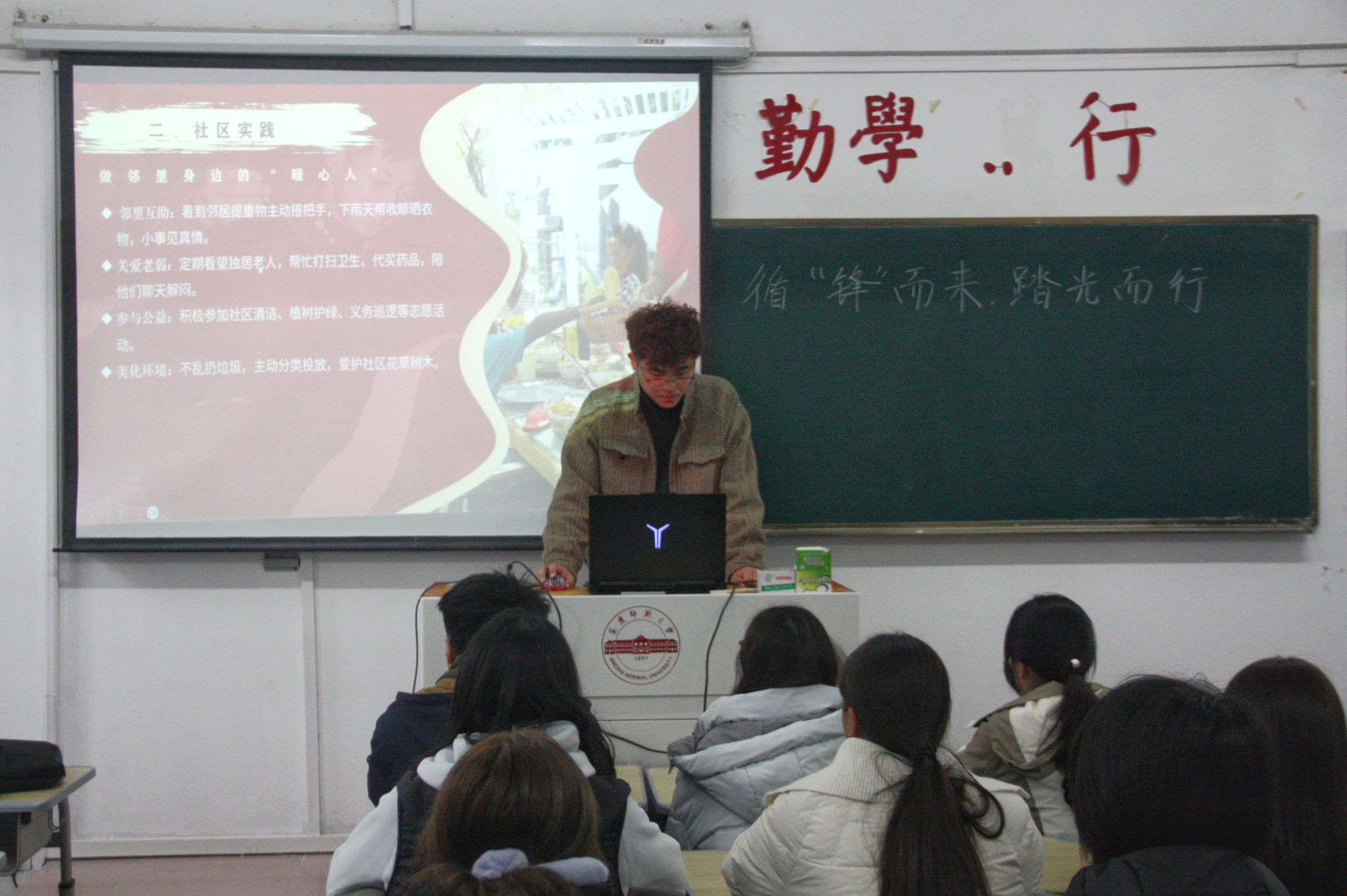 3月5日,“传承雷锋精神”主题交流分享会正在教学楼313教室举行。2025级中国语言文学类专业(1)班的胡文琦担任主讲人。她以“精神解码、当代镜像、行动指南、时代回响”四个维度为脉络,层层递进,生动勾勒出雷锋同志无私奉献的光辉一生。在研讨交流环节,大家结合实际围绕雷锋精神的实践路径开展交流。2025级中国语言文学类专业(1)班的杨佩琪分享道:“这次分享会启发我自我价值也可以在平凡小事中实现。作为青年员工,我们要从身边做起,爱护集体、文明有礼,做一个有温度、有担当的人。”