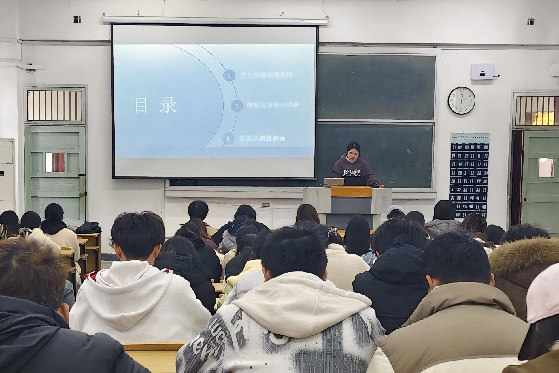 讲座围绕常见校园消费陷阱、维权途径、消费指南,用真实案例介绍了青年学子身边常见的消费陷阱,梳理了保留消费凭证、与商家协商、向平台投诉、拨打12315热线等维权步骤,明确了老员工维权的合法途径与注意事项。