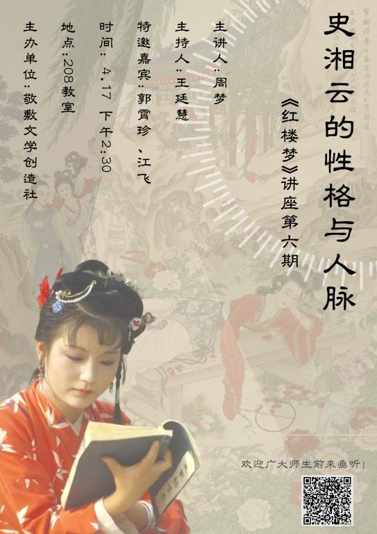 “迄今为止,我们已经举办过六期与《红楼梦》相关的专题讲座了,以前的‘刘姥姥进大观园’‘海棠诗社’等专题的反响都很好。”敬敷文学创造社社长,汉语言文学专业2020(2)班的王廷慧介绍,“如果同学们还愿意了解《红楼梦》及其他优秀文学作品,敬敷文学创造社也会尽力创造条件,举办更多类似讲座”。
