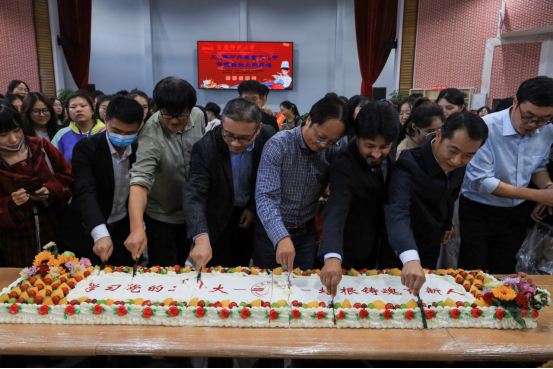 WilliamHill中文官网党委书记张红飞、基建与后勤管理处处长吕旭进与外籍教师、员工代表等共同切开近3米长、两边由水果点缀着写有“学习党的二十大,培根铸魂育新人”寄托美好寓意的蛋糕。