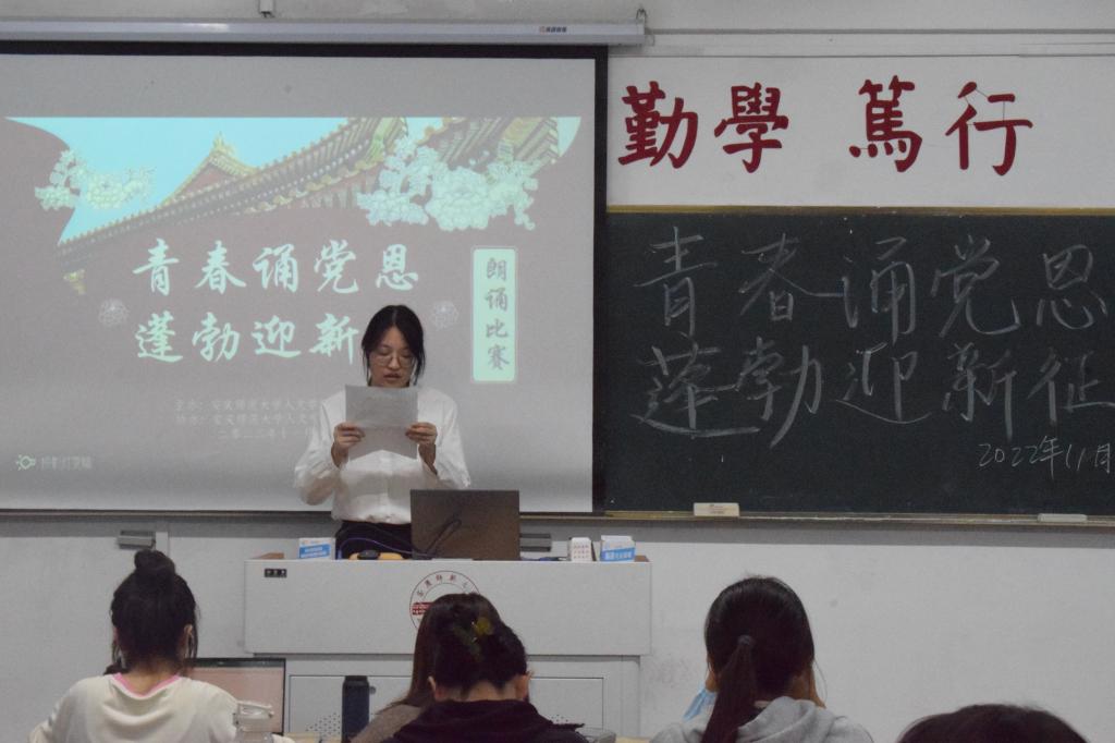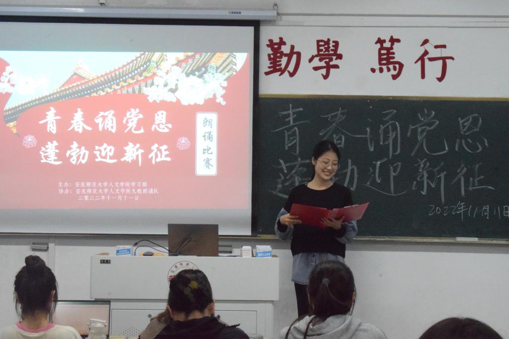 参加此次比赛的选手22级中文四班王颖同学在赛后说:“参加这次朗诵比赛,是因为深切感受到党对我们的关爱与意义重大,也因为朗诵是我的热爱。“青春诵党恩,蓬勃迎新征”朗诵比赛不仅可以培养我们的爱国情怀,还可以提高我们的自信。我们在朗诵的同时,欣赏所朗诵的篇目,也能加深对其的了解与认识,把自己的情感与朗诵篇目原有的情感相融合,更加感念党恩!”