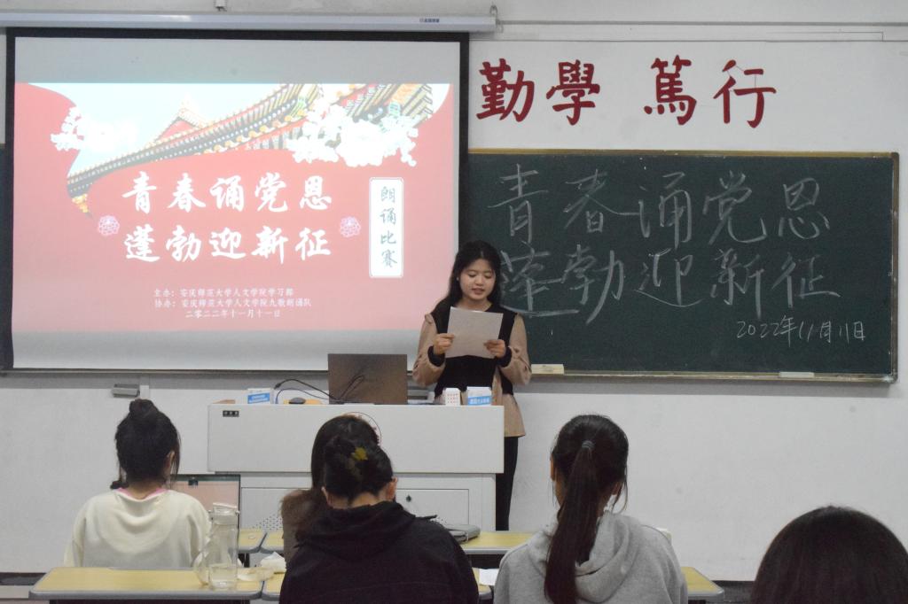 本次比赛以“青春诵党恩,蓬勃迎新征”为主题,选手们通过独诵的方式,借助音乐、服装等灵活多样的道具,现场展现与党和祖国相关的诵读内容,评委进行现场评分。