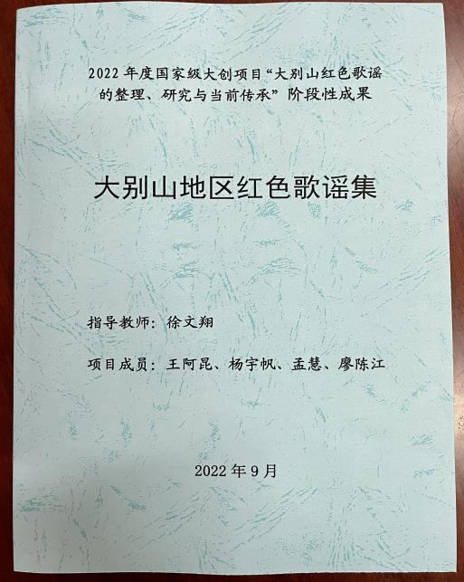 近日,WilliamHill中文官网2020级汉语言文学专业王阿昆、杨宇帆、孟慧、廖陈江等四名同学在徐文翔老师指导下,整理完成《大别山地区红色歌谣集》。作为2022年度国家级大创项目“大别山红色歌谣的整理、研究与当前传承”的阶段性成果,《大别山地区红色歌谣集》共收录土地革命战争时期到解放战争时期的大别山地区红色歌谣230余首,是目前为止最为完备的同类歌谣辑录。这些红色歌谣体现了大别山地区的革命精神,是大别山红色文化的重要组成部分,对当前大别山红色文化的传承有重要的参考价值。