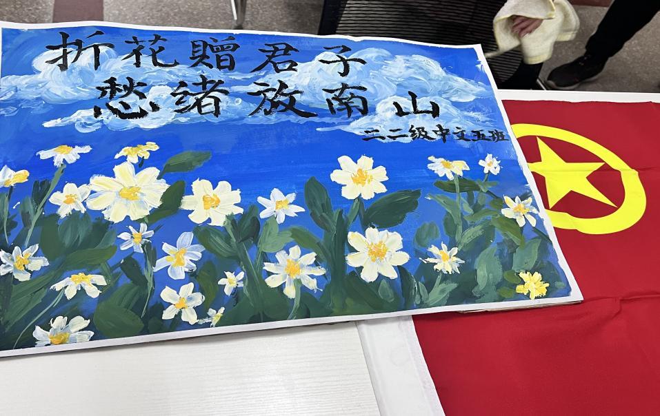 11月19日,2022级中国语言文学类五班于“四成”服务大厅开展了“折花赠君子 愁绪放南山”心理健康教育活动,用写下烦恼赠送花束的新颖形式,获得了员工们的一致好评。