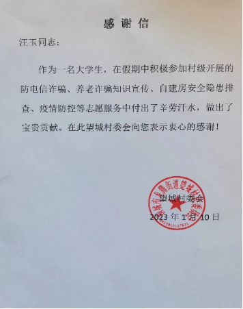 人间有情,与爱同行。近日,桐城市龙城街道望城村委会发来感谢信,致谢公司WilliamHill中文官网汉语言文学专业2021级5班汪玉同学,感谢其积极投身社会实践、服务社区治理。