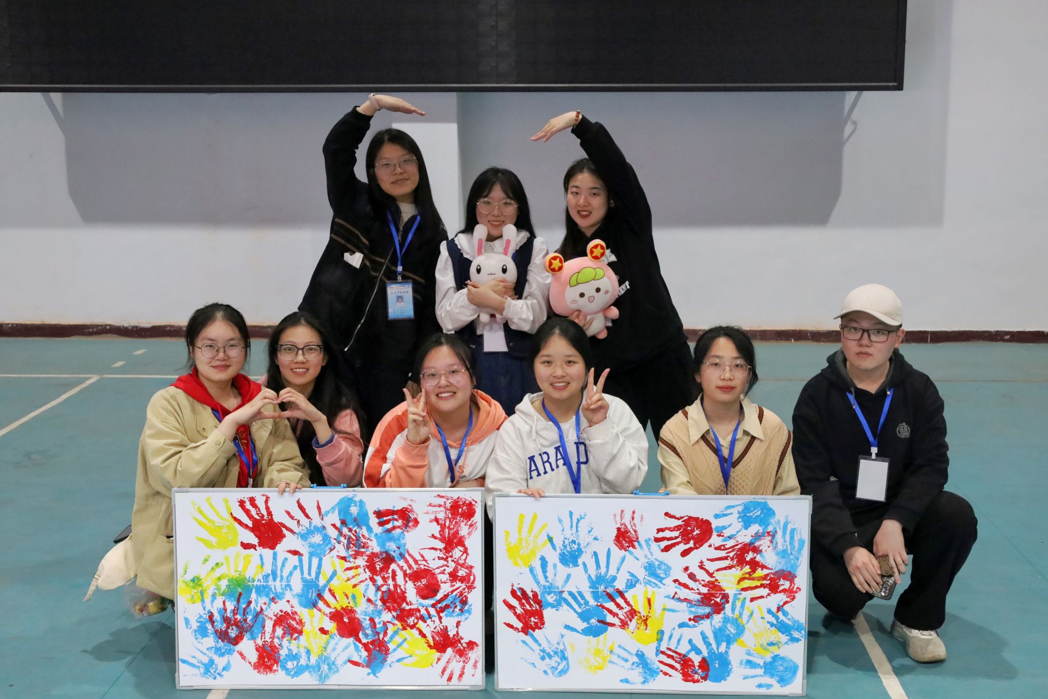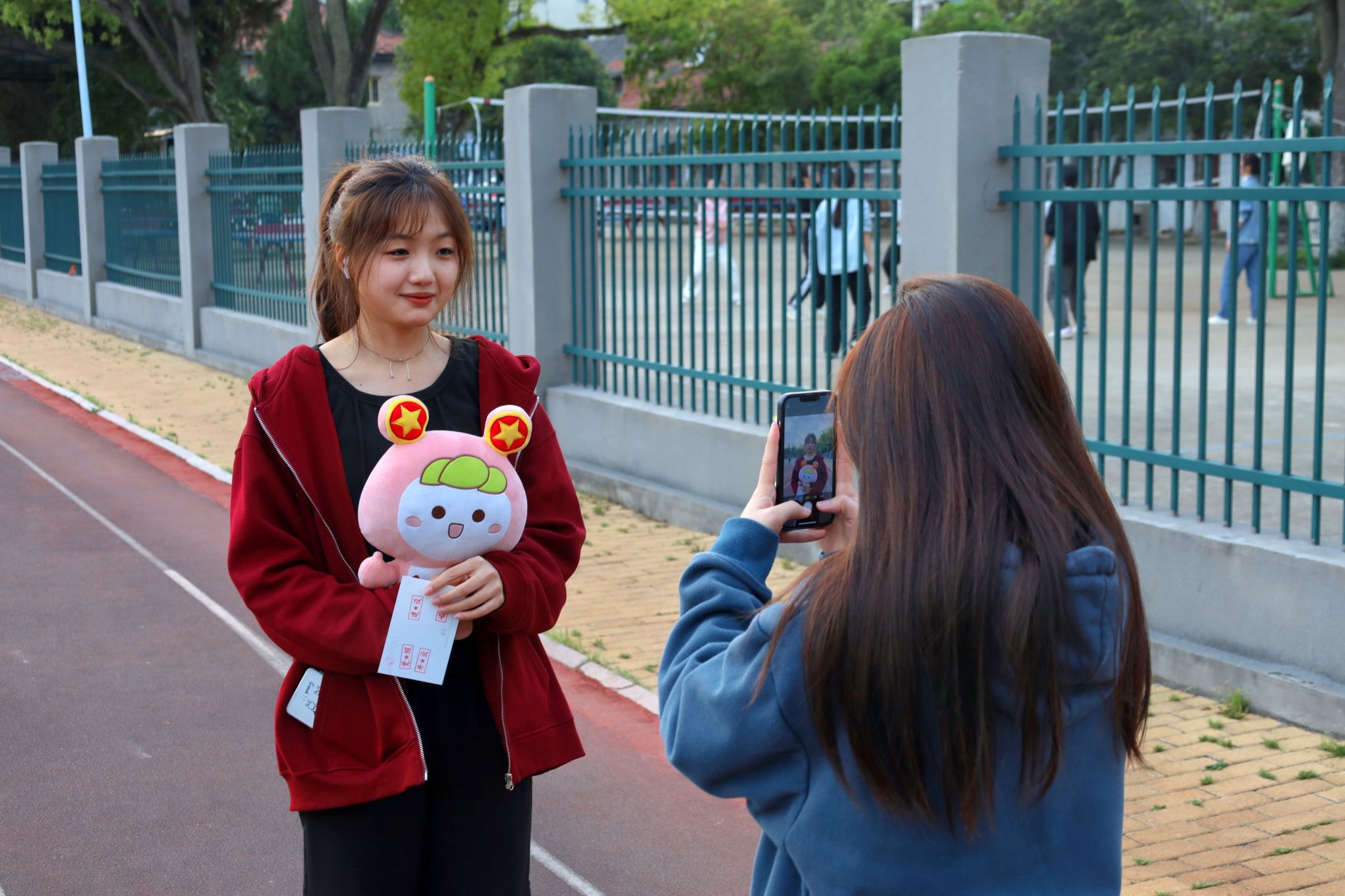 在操场的另一端,两只共青团吉祥物“惊艳亮相”,吸引员工们纷纷前来打卡围观。中国语言文学类2022级5班的李艳萍抱着吉祥物“团团”与“团兔”,摆出不同自拍造型合影留念。“吉祥物寓意着我们青年人团结一心、不懈奋斗的精神品质,不仅展现出我们对未来的憧憬,更启发我们要不断继承与发扬‘五四’精神。”