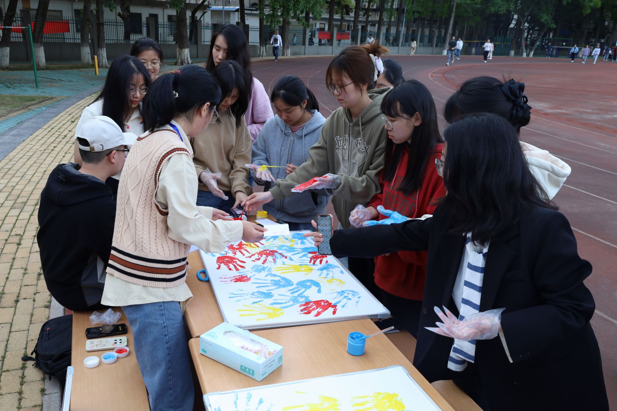 “大家先戴上pvc手套,再用刷子蘸取袋子里的颜料。”活动现场,员工们在摆点处可领取到一张空白纸张,进行手印画的创作。工作人员耐心地指导每一位参与员工印下自己的手印,并向员工们介绍该活动的寓意所在:“青年员工留下彩色的手印,寓意青年学子‘为青春而喝彩’。”