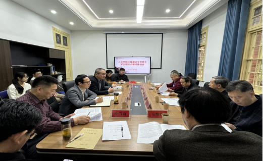 沈志富就中国语言文学硕士学位授权点周期性合格评估的准备情况、院内专家和校内专家评审情况做了汇报说明。金松林从学位授权点基本情况、团队力量与科研成果、招生与人才培养体系、服务经济社会发展、存在问题与改进计划等五个方面汇报了学位点近五年来的建设情况。