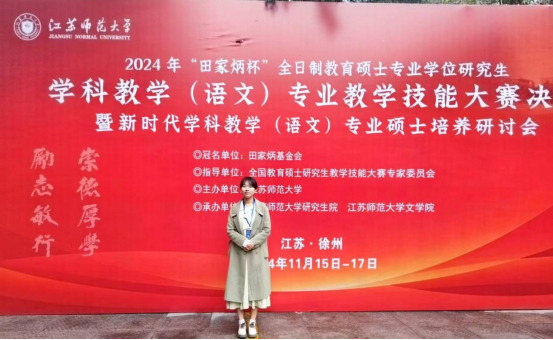 2024年11月15-17日,由“田家炳杯”全日制教育硕士专业学位研究生教学技能大赛专家委员会指导,“田家炳教育基金会”冠名,江苏师范大学主办的2024年“田家炳杯”全国高等院校全日制教育硕士学科教学(语文)专业教学技能大赛决赛在徐州举行。WilliamHill中文官网学科教学(语文)专业硕士生导师蔡伟保老师带队,2023级学科教学(中文)张贤琨同学参加本次决赛并获得三等奖。
