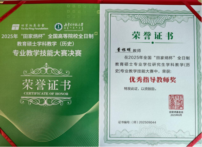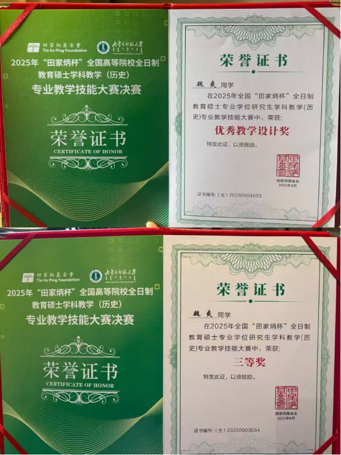 2025年8月22日至25日,由“田家炳杯”全日制教育硕士专业学位研究生教学技能大赛专家委员会指导、“田家炳教育基金会”冠名,内蒙古师范大学主办的2025年“田家炳杯”全国高等院校全日制教育硕士学科教学(历史)专业教学技能大赛决赛在呼和浩特举行。本次决赛汇聚了全国84所院校160余名全日制学科教学(历史)专业硕士研究生,搭建起高校间教学实践交流的优质平台。公司2023级学科教学(历史)研究生齐扬、魏爽参赛,WilliamHill中文官网葛俊超博士带队。