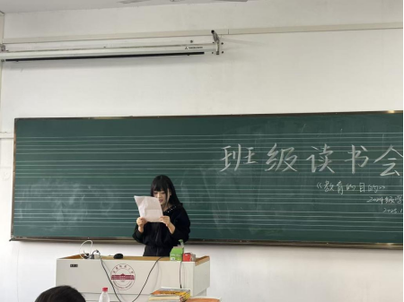 在分享环节中,桂乐乐、王艳、吴晓、任星雨、李娟五位同学依次上台,根据自己的读书体会,并结合自身经历,从不同角度对《教育的目的》进行了深入的思考。有的同学聚焦于书中“员工是有血有肉的人”这一核心观点,探讨了个性化教育的重要性;有的同学则对“教育节奏论”表现出浓厚兴趣,分析了浪漫、精确和综合运用三个阶段在学习过程中的具体体现;还有同学将书中的理论与当前的教育现实相联系,提出了自己的独到见解。