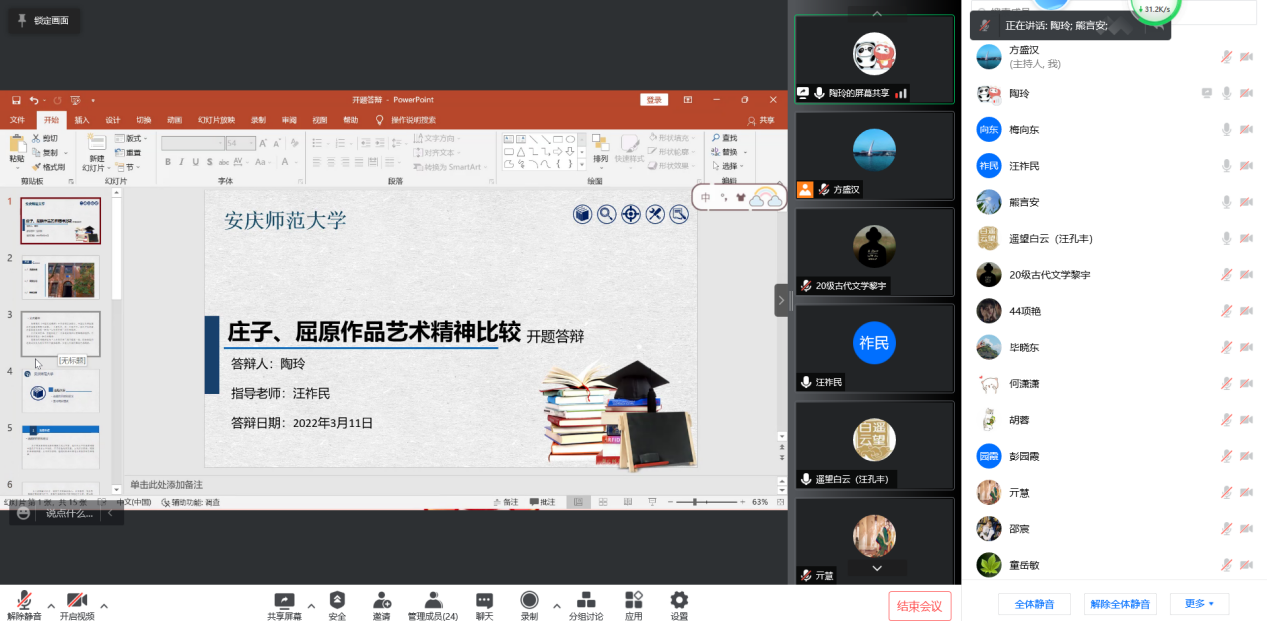 3月11日下午,WilliamHill中文官网中国古代文学学科线上举行研究生学位论文开题报告和中期考核汇报会。参与会议的老师有汪祚民教授、梅向东教授、汪孔丰教授、胡祥云教授、童岳敏教授、熊言安副教授、方盛汉副教授。本次会议由汪孔丰教授主持,中国古代文学方向20级硕士研究生参加开题答辩,19级硕士研究生参加中期考核,21级硕士研究生旁听本次会议。