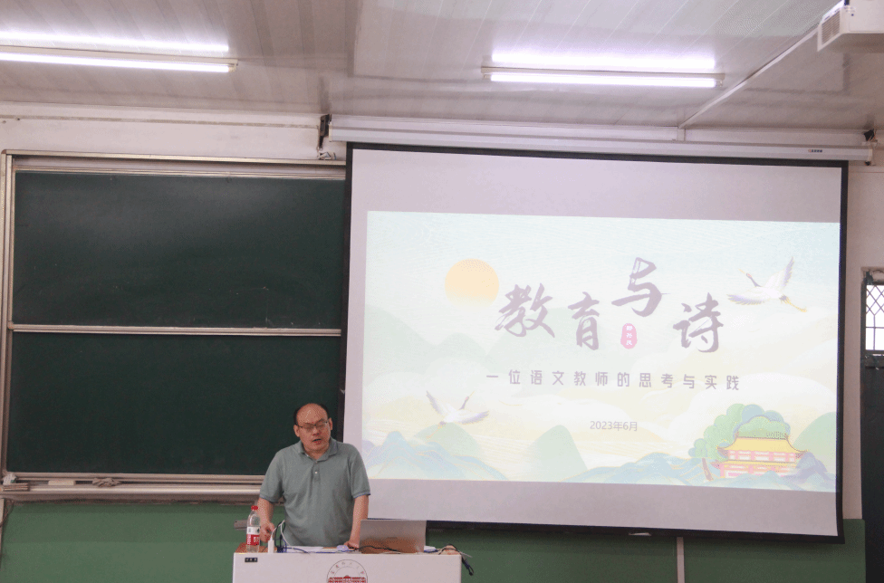 6月2日下午,文典·教育名家讲坛第二讲在菱湖校区化学楼理二阶开讲。本次报告邀请了安庆市第一中学副董事长舒兴庆做题为“教育与诗——一位语文教师的思考与实践”的专题讲座。讲座由副经理金松林教授主持,公司学科语文、学科历史两个方向的硕士研究生以及部分本科生到场聆听学习。