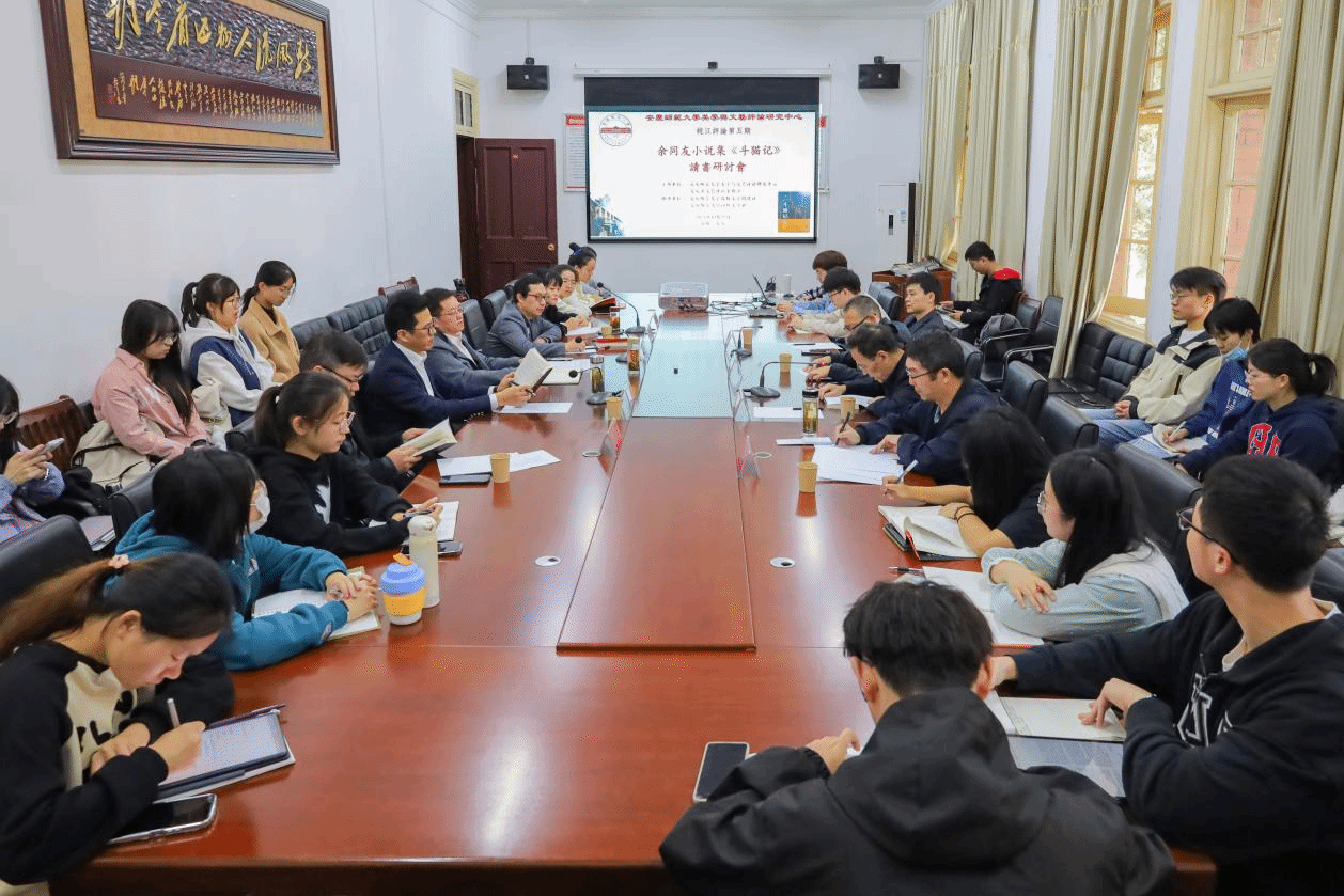 会议开始,陈宗俊教授对四位嘉宾进行了简短的介绍。在作品交流讨论环节,大家就《斗猫记》的小说结构、人物塑造、思想内容、艺术手法等方面进行了深入探讨。大家认为,短篇小说集《斗猫记》着力书写大时代中的小人物,集中表现了乡村城镇化转型中底层民众的生存困境和精神境遇,坚持和践行了现实主义立场与人道主义原则,是一种有思想、有情怀、有力度的“新乡村叙事”。作家余同友始终保持一种客观、冷静的笔调,并有意识地运用现代主义的荒诞、反讽、象征等手法,以一个社会观察者的角度挖掘人性的善恶,在生活日常处注入理性的批判思考,显示出一位“70后”作家强烈的社会责任感。此外,大家还就《斗猫记》小说中是否存在同质化、小说文本与文学评论之间的关系等问题进行了热烈的讨论。整个读书研讨会思想交流碰撞激烈,现场气氛活跃。最后余同友对嘉宾和老师们的发言以及同学们的提问表示了感谢,对研讨会上提出的各种问题进行了解答,并且谈及了自己在小说创作中童年经历的影响以及创作的经验。会议结束后,全体嘉宾和师生在红楼前合影留念。