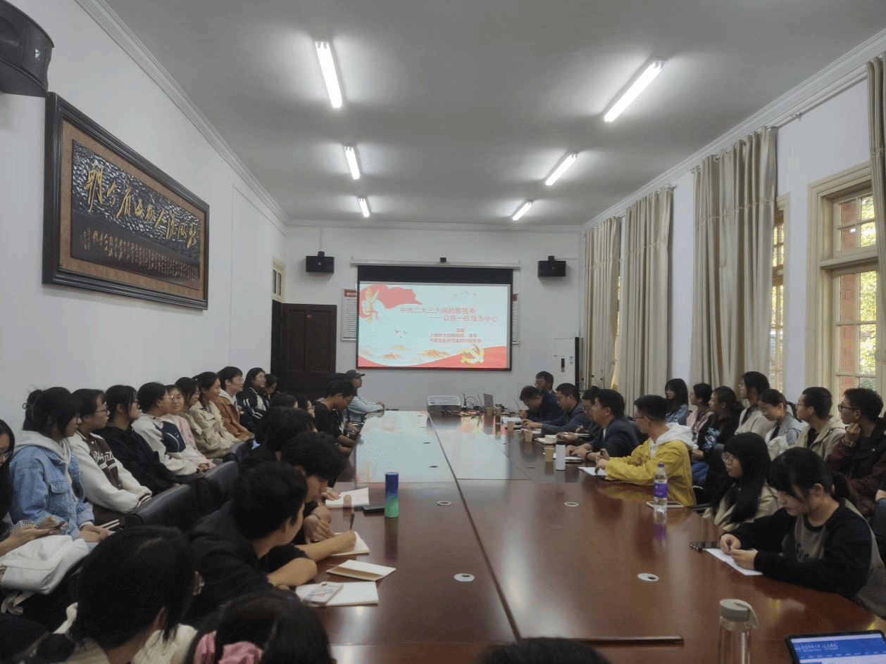 邵雍教授首先阐述了中共二大提出“民主的联合战线”的缘起,指出中共二大提出“民主的联合战线”是我党统一战线的伟大开端。随后,邵雍教授分别介绍了陈独秀在妇女运动、青年运动、工人运动方面的初步统战实践,同时分析了“民主的联合战线”接连受挫的原因和共产国际四大期间陈独秀的突出表现,阐述了陈独秀主持的中共三大如何贯彻共产国际的统战策略以及取得的历史贡献。讲座结束后,邵雍教授与现场师生进行亲切互动交流,不仅耐心答疑释惑,而且分享了自己丰富的治学经验和体会,现场气氛热烈,掌声经久不息。