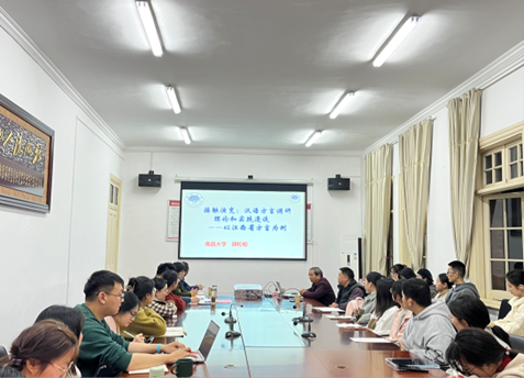 胡松柏教授首先从江西四通八达的地理位置解释了其方言的复杂多样性,简单介绍了江西的五大方言及其方言接触现象,认为通过接触性方言共有成分,分清方言之间历时和共时的关系,能够理清方言的演化线索。紧接着,他从方言接触的方式和表现、态势和趋势两个方面,具体介绍了江西各方言在语音、词汇和语法上的接触情况,论述了方言在接触中的地位和程度及其特征的消磨、使用的更替、地域的扩张和退缩等。在讲座中,胡教授还结合自己丰富的研究经验对方言调研的问题提供了许多新颖的视角和思路,鼓励在座员工认真治学,学会从调查中发现问题,带着问题去调查,并提醒大家注意方言和文化的连接。讲座结束,胡教授和与会师生进行了深入交流并向中心赠送了方言研究的系列著作。