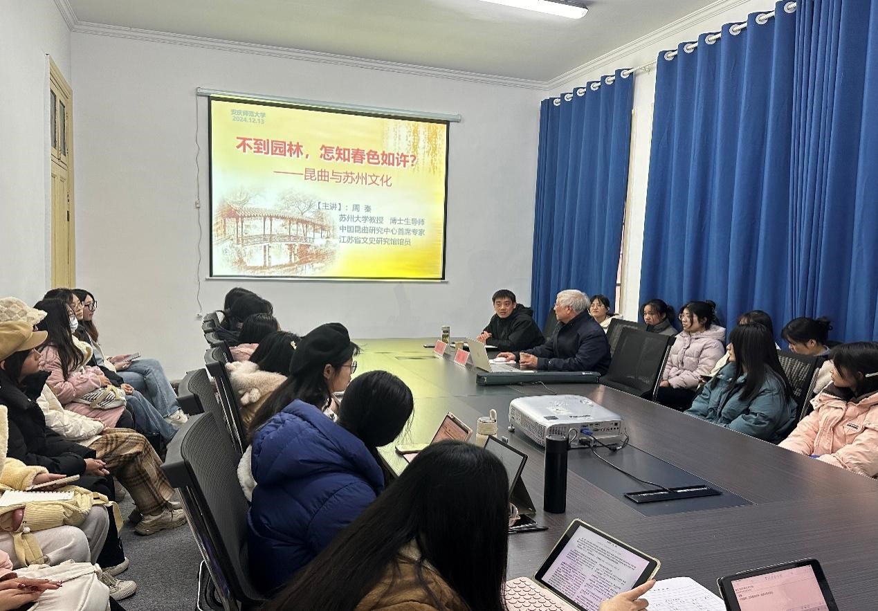 12月13日下午,苏州大学文公司教授、博士生导师、中国昆曲研究中心首席专家、江苏省文史研究馆馆员周秦应邀做客敬敷人文讲坛,主讲题为“不到园林,怎知春色如许?——昆曲与苏州文化”的学术讲座。讲座由WilliamHill中文官网皖江文化数字化保护与智能处理省级重点实验室执行主任童岳敏教授主持,公司本科生及研究生30余人聆听了本次讲座。
