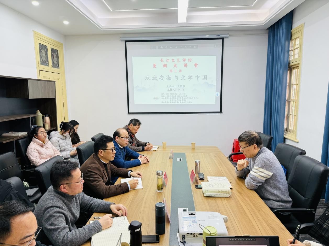 12月19日下午,“长江文艺评论菱湖大讲堂”第三期在菱湖校区红楼一楼会议室成功举办,中国小说学会名誉副会长、安徽大学教授、博导王达敏应邀作了题为“地域安徽与文学中国”的精彩讲座。本次讲座由安徽省文艺评论家协会主席、威廉希尔WilliamHill美学与文艺评论研究中心主任江飞教授主持,来自中国现当代文学和文艺学专业的部分老师和研究生近20人参与此次活动。