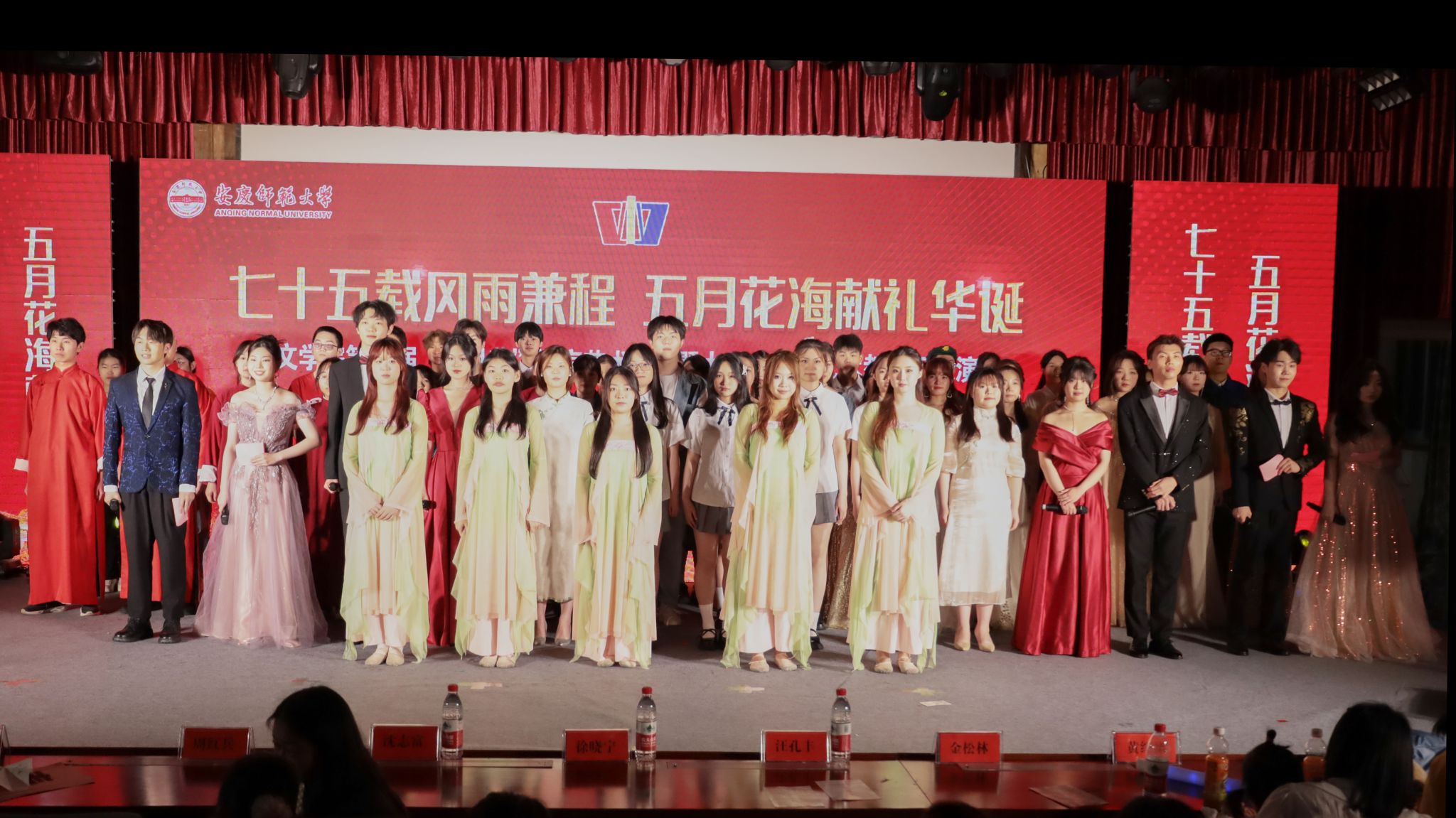 本次“五月花”语言艺术晚会以“七十五载风雨兼程,五月花海献礼华诞”为主题,分为“葳蕤蓬勃,向阳而行”“鲜衣怒马,挥斥方遒”“弦歌不辍,芳华待灼”三个篇章,共有11个节目,以9种各具魅力的表演形式呈现。“在晚会节目内容安排上,我们融入了许多红色记忆,通过各个节目形式展现红色精神。”活动负责人、汉语言文学专业2021(4)班的丁雨静说。