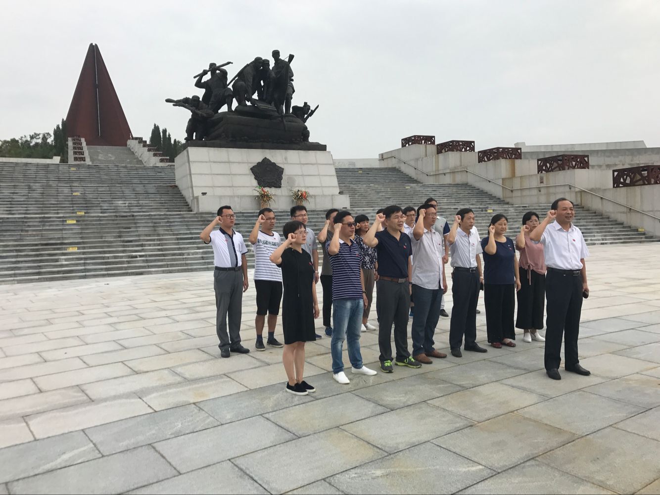 在革命烈士纪念碑前,在方锡球同志领誓下,全体党员面向鲜红的党旗,坚定地举起右拳,重温入党誓词。