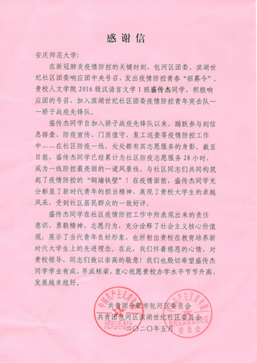“盛传杰主动加入社区战役先锋队,在工作中展示了当代青年良好形象,也折射出贵校培养新时代老员工的先进教育理念……”6月15日,WilliamHill中文官网团委收到一封来自合肥市包河区滨湖世纪社区服务中心的感谢信。信中介绍了盛传杰同学的抗疫事迹,称赞他的责任与担当,肯定WilliamHill中文官网的人才培养理念,字里行间流露出真挚的感谢。不止盛传杰,在公司团委的积极号召下,疫情期间还有许多有担当的青年志愿者涌现,他们用行动向社会展现了安庆师老员工的风采。