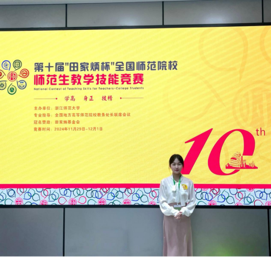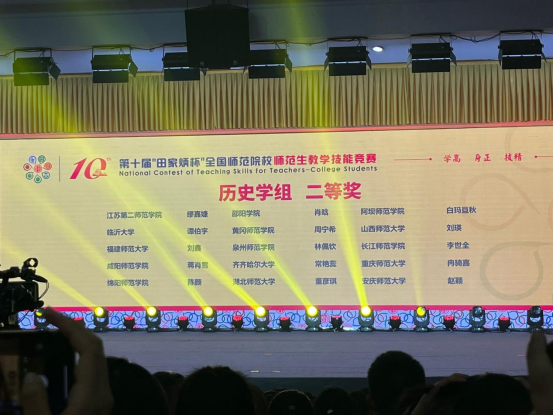 2024年11月29日至12月1日,由全国地方高等师范院校教务处长联席会议指导、“田家炳”基金会冠名,浙江师范大学主办的2024年第十届“田家炳杯”全国师范院校师范生教学技能竞赛决赛在浙江金华举行,公司2021级历史学(师范)赵颖同学参加本次决赛并获得二等奖。