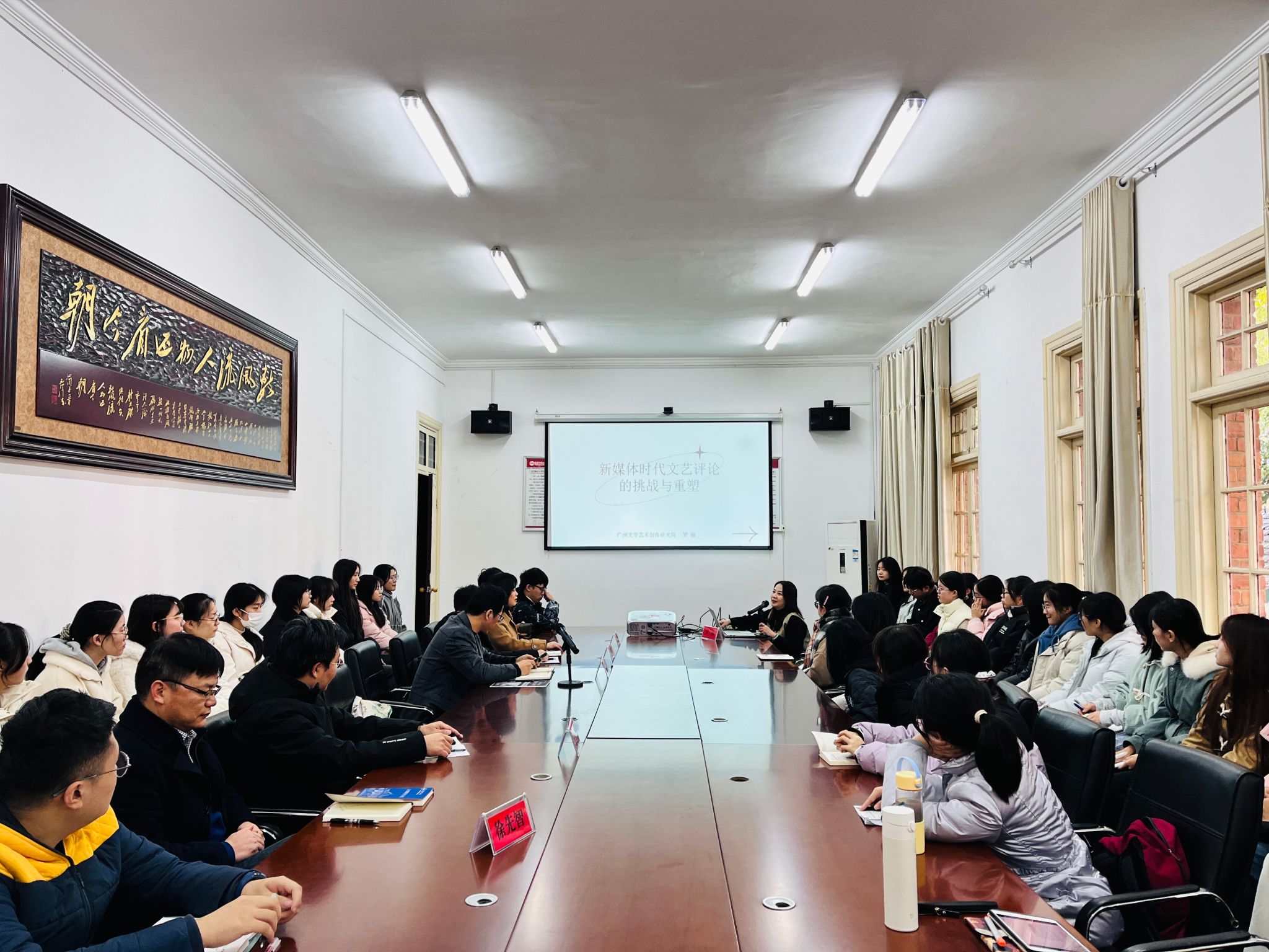12月6日下午,文艺评论家菱湖大讲堂第一期成功举办。中国文艺评论家协会理事、广东省文艺评论家协会副主席、广州市文艺评论家协会主席、国家一级编剧罗丽应邀作了题为“新媒体时代文艺评论的挑战与重塑”的精彩讲座。本次讲座由安徽省文艺评论家协会副主席,威廉希尔WilliamHill美学与文艺评论研究中心主任江飞教授主持,WilliamHill中文官网副经理周红兵、中心副主任陈宗俊教授和专职研究员以及公司“文典班”、研究生近五十人参与。