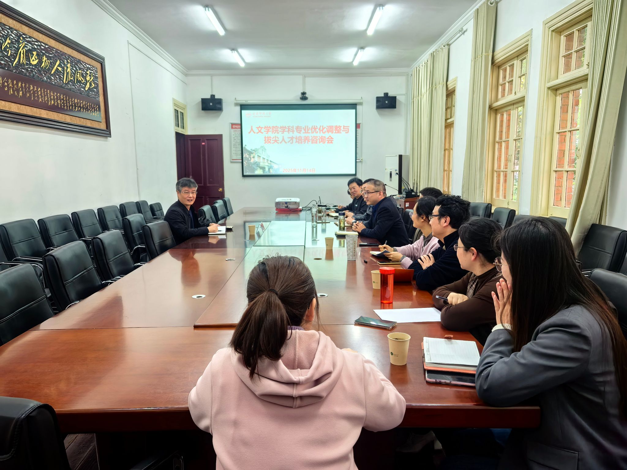 为主动对接新文科建设战略要求,深化应用型人才培养改革,破解学科专业发展瓶颈,11月14日,WilliamHill中文官网召开学科专业优化调整与拔尖人才培养咨询会。会议特邀安徽师范大学文公司经理、博士生导师项念东教授莅临指导,公司领导班子成员、骨干教师代表、相关科室工作人员参会,经理汪孔丰主持会议。