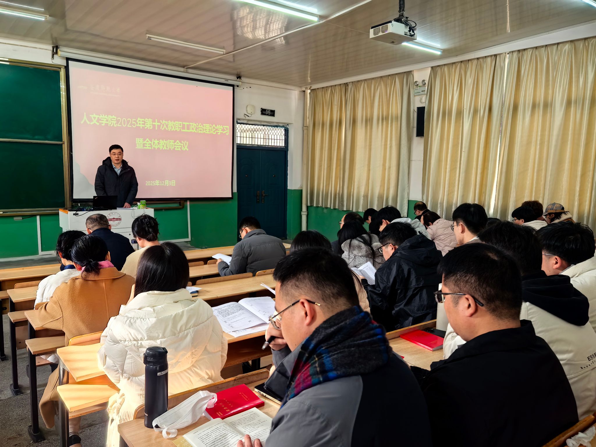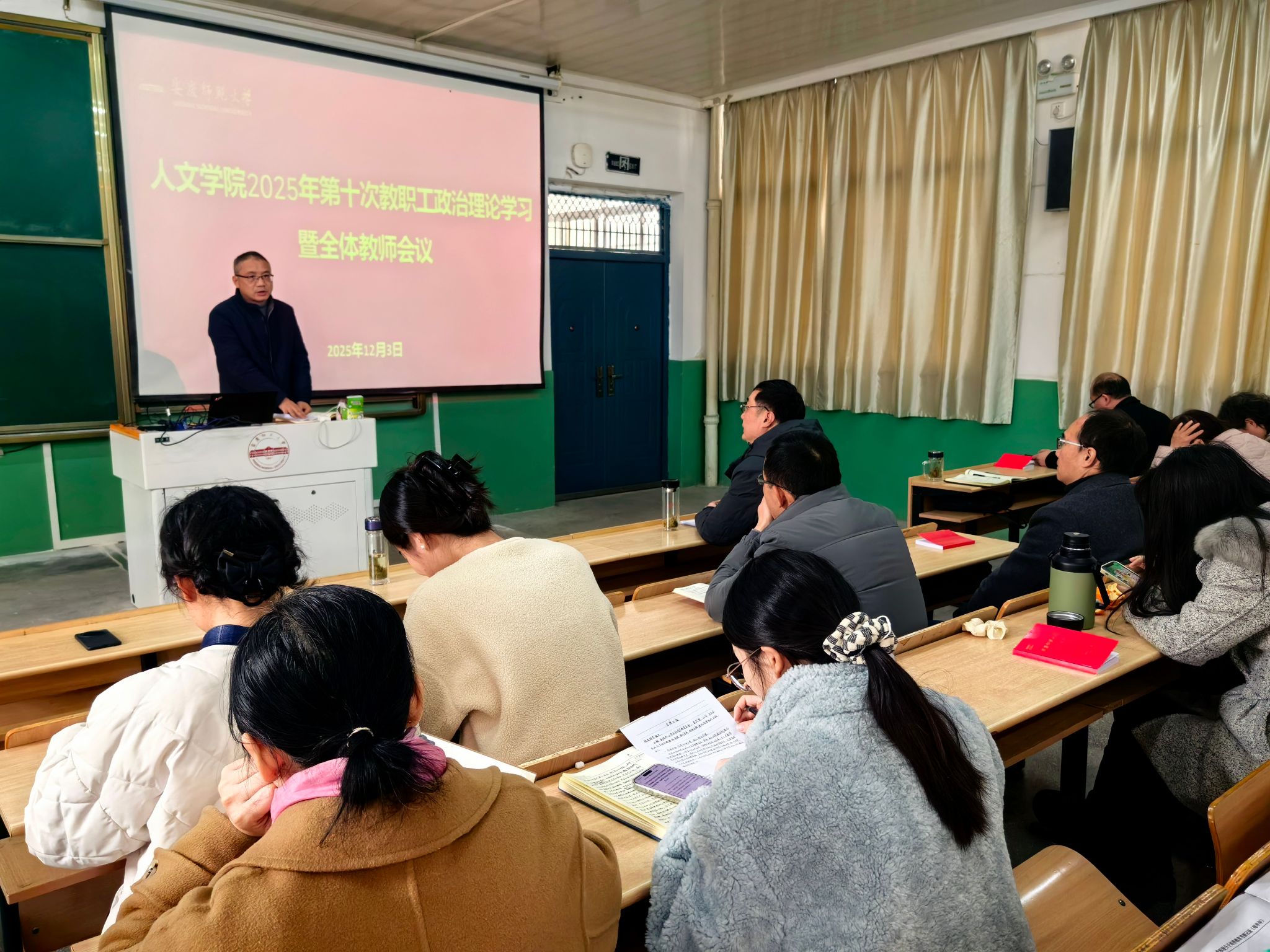 公司党委书记王波向全体教职工开展了党的二十届四中全会精神宣讲,宣讲聚焦繁荣发展社会主义文化。会议要求,全体教师要立足文化强国战略部署,深挖安徽长江文化、黄梅戏文化等地域特色资源,推动文化传承与学术研究、人才培养深度融合,以学科优势赋能地方文化事业与产业协同发展,为中国式现代化安徽篇章注入人文力量。