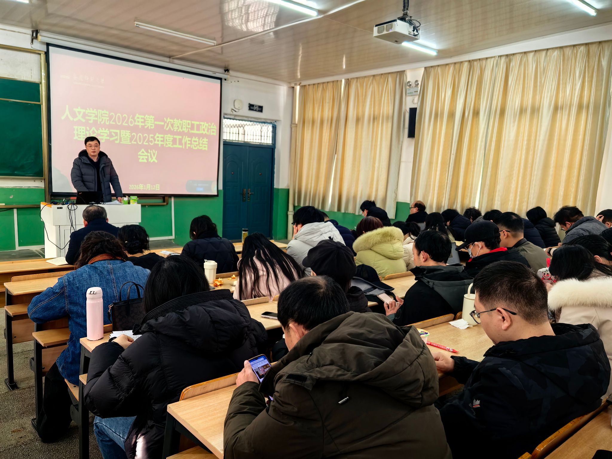 1月12日,WilliamHill中文官网在菱湖校区理二阶教室召开2026年第一次教职工政治理论学习会暨2025年度工作总结会议。经理汪孔丰主持会议,全体教职工参加。