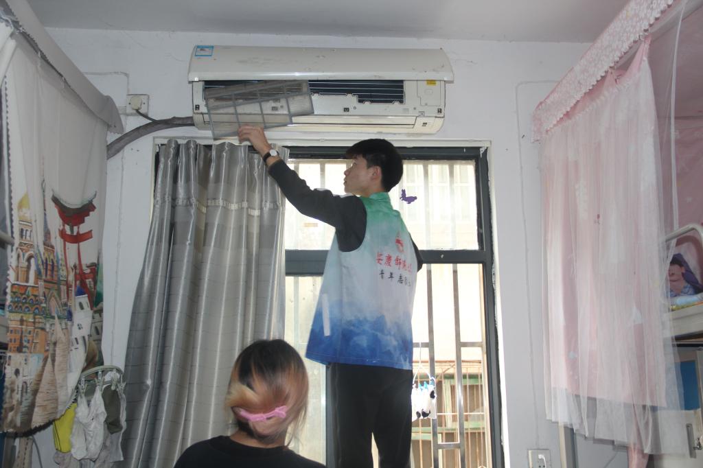 74名志愿者在负责人员的统一安排下,两两组合,进入提前分配好的寝室。空调断电,扶稳椅子,拆卸外壳,抽出滤网,清洗滤网……志愿者们不辞辛劳互帮互助,将滤网清洗干净。最后,志愿者帮助各寝室安装清洗烘干后的滤网。虽然是一项艰苦的工作,但志愿者乐此不疲。“我感觉这是一项很新颖的志愿活动,很温暖,也很有意义。”2021级汉语言文学五班的胡耀威说。