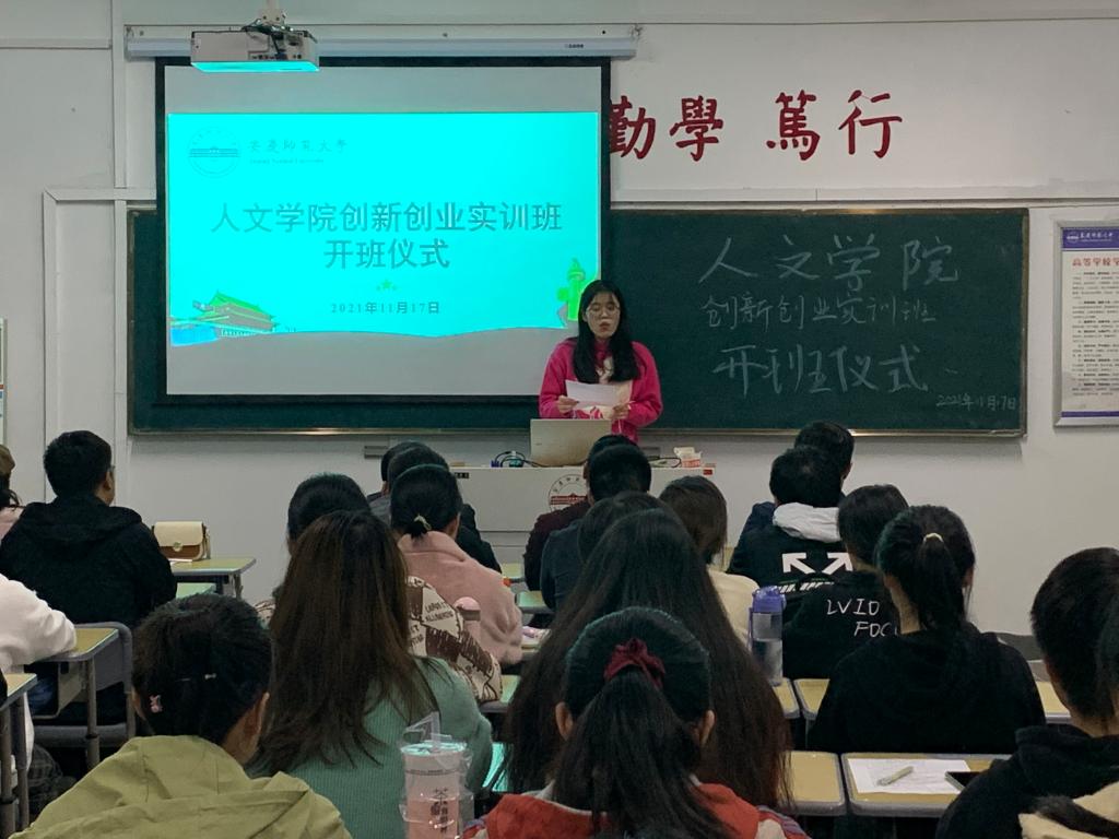 2019级汉语言文学八班陈晨代表创新创业班学员发言,她从国家层面和个人层面表达了自己对于创新创业的理解,以及想要学习创新创业知识的愿望。并代表学员承诺认真学习,保证学有所成。