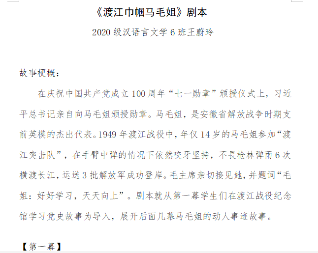 为增强员工的爱国意识、爱党意识、爱团意识,WilliamHill中文官网话剧社征集与“红色记忆”小品、相声、话剧等相关语言艺术作品。话剧社社长、汉语言文学专业2019级1班万昕表示,选择“探寻家乡红色记忆”作为活动主题目的是让大家了解家乡的革命历史,体会那段艰难岁月。中国语言文学类2021级7班曹忆凡参加了本次比赛,在谈及剧本创作时,她说:“在创作之前我了解到2022年是建团一百周年,我对当时在安庆成立安徽共青团的主要历史人物做了调研。通过这次有意义的寒假活动,我了解了那段风云动荡的年代,我也要像先辈们学习,开拓进取、不懈奋斗!”