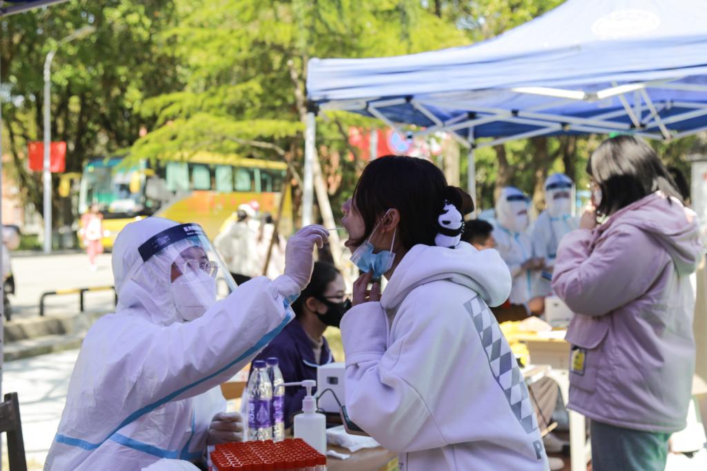 在核酸采集现场,师生自觉佩戴口罩,有序排队,分批进入,保持距离,排队等候,即采即走。医务人员身着防护服,戴口罩、护目镜和医用一次性手套,严格按照规范检测流程进行信息登记,核酸采样。整个过程有条不紊,井然有序。