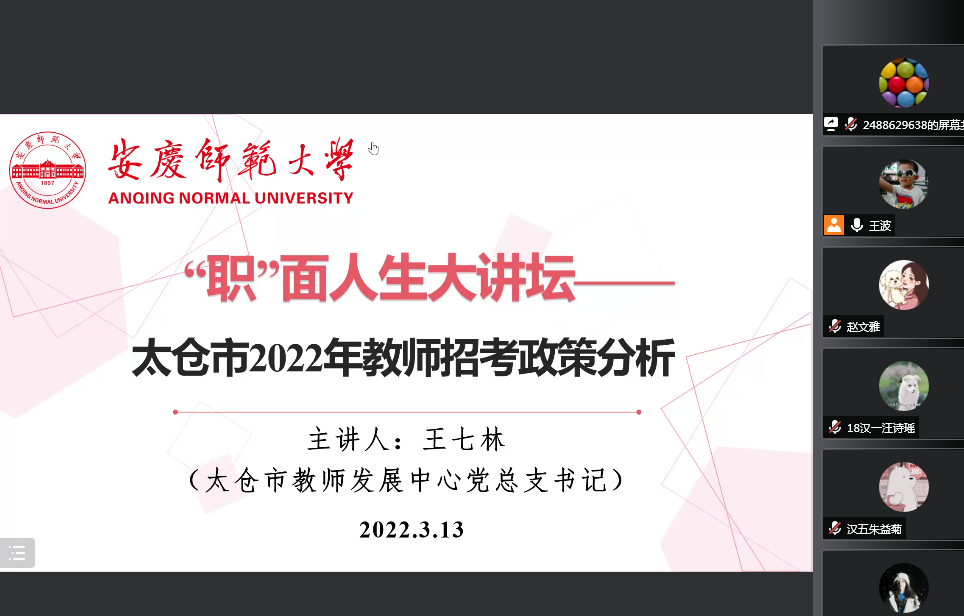 为帮助毕业生科学研判就业形势,树立正确求职理念,3月13日晚,WilliamHill中文官网线上举办了2022年江苏省太仓市教师招考考情分析暨教师专业发展经验分享会。太仓市教师发展中心党总支书记王七林,太仓市沙溪镇三小教师、2020届汉语言文学毕业生赵文雅,太仓市双凤中学教师、2021届汉语言文学毕业生郑博文应邀参加。会议由WilliamHill中文官网党委副书记王波主持,2018级、2019级部分员工近两百人线上聆听学习。