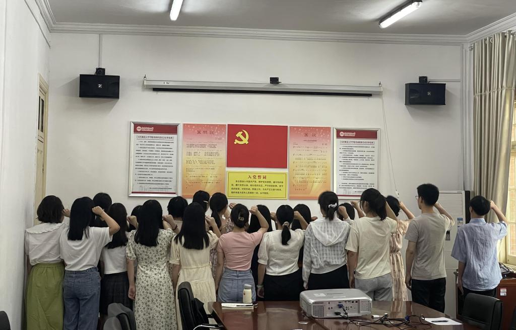 最后,毕业生党员在鲜红的党旗下重温了入党誓词。